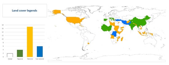 To overcome the inconsistencies in generic classification systems, dozens of countries and international organizations have now created land cover datasets using the Food and Agriculture Organization of the United Nations (FAO) Land Cover Classification System (LCCS) based on Land Cover Meta Language (LCML-ISO 19144-2) []. In LCML, the land cover classes are defined using a hierarchical structure [,]. This system does not intend to alter or replace the previous classification systems. Nonetheless, it provides a consistent framework for the comparison and integration of data for any generic land cover classification [], building upon the involvement of FAO in several countries. Therefore, these datasets can be used for integration and harmonization processes to analyze the results and changes at the global, regional, and national levels.