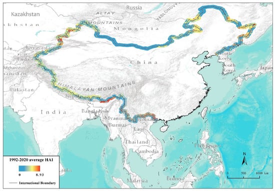 Figure 4 shows the mean HAI spatial distribution from 1992 to 2020. The HAIs of the China–Kazakhstan, China–India, and China–Russia border areas are relatively high. There are high HAI clusters with concentrated and contiguous regions due to fertile land, especially the Brahmaputra Valley Plain of India, located in the piedmont alluvial plain of the Qinghai-Tibet Plateau. Furthermore, India proposed the “Border Action Development Plan” in 2016, which promoted infrastructure construction in border areas and accelerated the settlement of border residents. The China–Kazakhstan border region presents local high HAI levels due to the good terrain conditions, mainly in the Ili River Valley. Since 2013, Kazakhstan has become a key transit area along two important border crossings with China: The Alashankou/Dostyk crossing and the Khorgos/Altynkol crossing [52]. International cooperation, such as through the “Belt and Road” initiative, accelerates the growth of the HAI in this region. The scattered border ports and cities with high HAI values include Heihe, Dandong, Yanji, Ruili, and Hekou in China, and Khabarovsk, Blagoveshchensk in Russia, Phuong in Vietnam, and Muse in Myanmar. The HAI is low in high latitude regions such as the China–Mongolia and China–Russia borders, where there are wildlife nature reserves. For example, the desert ecosystem in the Inner Mongolia Urad Haloxylon-Mongolia Wild Ass National Nature Reserve is extremely fragile. Shuanghe National Nature Reserve, one of the most desolate places in China’s north, is also cold all year round and is a protected fragile ecosystem due to being inconvenient for transportation.
