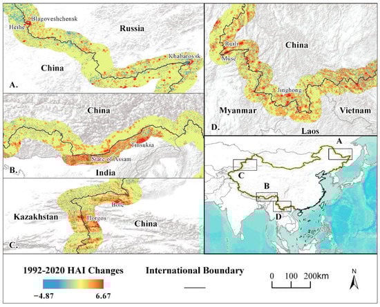 HAI changes in selected regions, 1992–2020. (A). The Sino-Russian border area, including the Fuyuan Delta, Heihe; (B). The east part of the Sino-Indian border area, including Assam in India and Nyingchi in China; (C). China–Kazakhstan border area, including Bortala Mongolian Autonomous Prefecture and Yining city in China, and the Almaty Region in Kazakhstan; (D). China and the Indo-China Peninsula border area, including the cross-border regions between China and Myan-mar, Laos, and Vietnam.