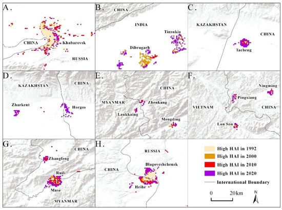 High HAI areas change form. Unilateral expansion areas (A–C); Bilateral expansion areas (D–F); Cross-border integration areas (G,H).