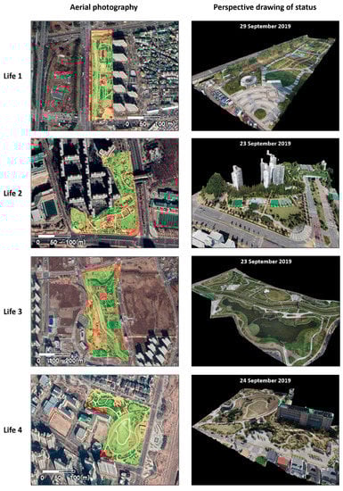 Eight urban parks were selected as the study sites, and the land cover status was analyzed using aerial photography (DJI’s Phantom 4 drone) and design drawings (Figure 3 and Figure 4).