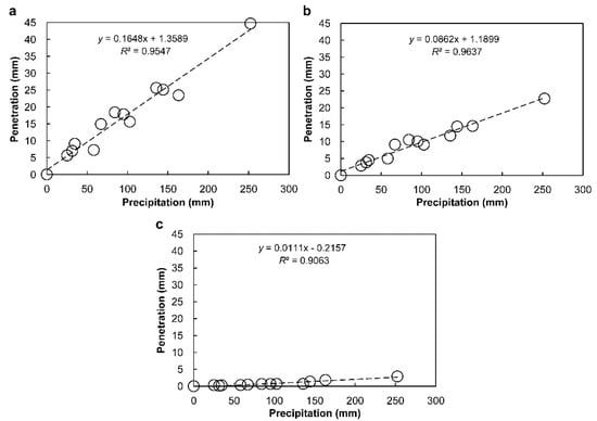 Amount of groundwater penetration compared to the monthly precipitation of the three ground materials: (a) regression equation for the vegetation area (Va) penetration; (b) regression equation for the permeable sidewalk (Ps) penetration; (c) regression equation for the some pervious sidewalk (SPs) penetration.