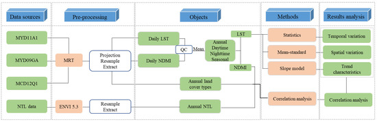 The primary objectives of the study are to (i) analyze the spatiotemporal variation of LST at different timescales in Henan Province from 2003 to 2021, and (ii) investigate the drive mechanism of LUCC, NTL, and NDMI on LST variation. The conceptualized diagram of the study, as shown in Figure 1, and the structure presents as follows: information on the study region, data resources, and methods will be presented in the Section 2, which will be followed by the results and discussion in Section 3. Finally, we end with a conclusion section to highlight the key points of the study.