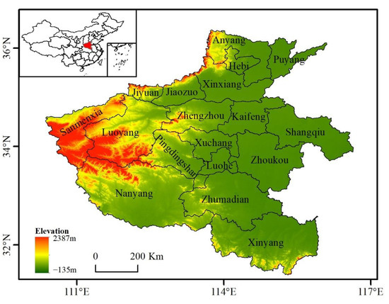 Henan Province, located in the middle of China, ranges from 110°21′ E–116°39′ E, 31°23′ N to 36°22′ N, with a total area of 16.7 × 104 km2. The elevation ranges from −135 m to 2387 m; terrain presents high in the west and low in the east (Figure 2). The western part of the province is dominated by mountainous and hilly terrain, while the southwestern part and central-eastern part in the province are dominated, respectively, by Nanyang basin and the Huang-Huai-Hai alluvial plain. Henan Province has a temperate continental monsoon climate, with four distinct seasons, rain and heat over the same period. It is windy and dry in spring, hot and rainy in summer, cool and sunny in autumn, and cold and less rainy in winter. The annual average air temperature ranges from 12.9 °C to 16.5 °C and the highest temperature occurs in July. The annual average rainfall varies from 464.2 mm to 1193.2 mm and it is mainly concentrated from June to August [29].