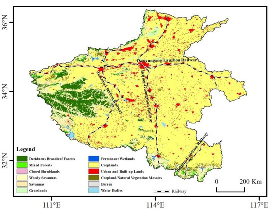 Henan Province is a major agricultural province in China; land cover is dominated by croplands (Figure 3). The annual average yield of the grain accounts for 66.49 million tons, and accounts for nearly 1/10 of the whole China [30]. Henan Province is also a populous province in China, with a resident population of 99.36 million and a population density of 595 people/km2 [28]. In addition, Henan Province governs 18 prefecture-level cities, including Zhengzhou city, Luoyang city, and Kaifeng city, etc., and most of urban and built-up lands are mainly distributed along the Beijing-Guangzhou railway, Lianyungang-Lanzhou railway, and Jiaozuo-Liuzhou railway lines (Figure 3).