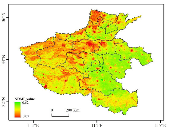 Multi-year average NDMI value for 2003−2021 in Henan Province, China.