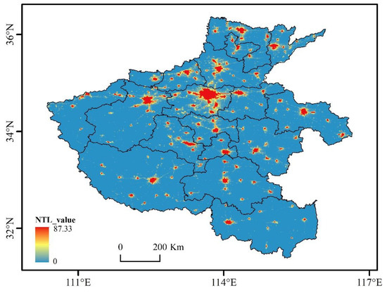 Multi-year average NTL brightness value for 2003−2020 in Henan Province, China.