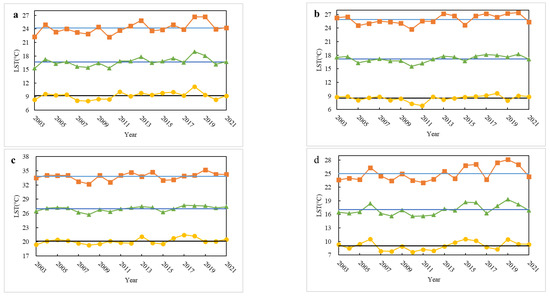 Characteristic of LST variation at seasonal scale (a) spring; (b) summer; (c) autumn; and (d) winter.