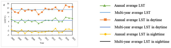 Spatial distribution of LST for 2003−2021: (a) daytime; (b) nighttime; (c) annual average.