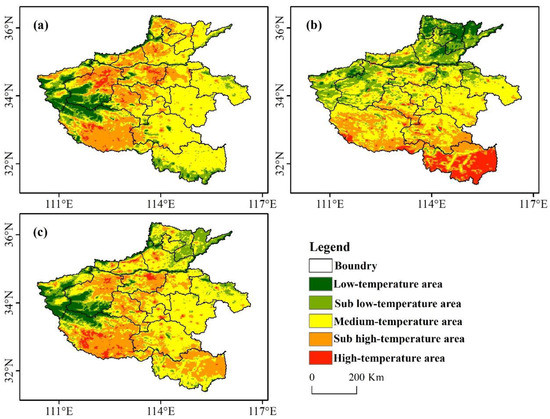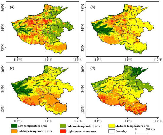 The LST was divided into five grades by the mean-standard deviation method [40] to analyze the spatial variation for Henan Province, from high to low, followed by high temperature, sub-high temperature, medium temperature, sub-low temperature, and low temperature (Table 1).