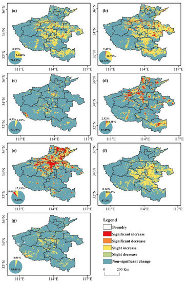 At seasonal scales, the warming rate in fall and winter was higher than that in spring and summer, with values were 0.10 °C/Y and 0.09 °C/Y, respectively. This was basically consistent with the predictions of previous studies [13,48]. The lowest warming rate was in summer, with a value of 0.047 °C/Y. It was perhaps because of that precipitation was mainly concentrated in summer, which slowed down the rise of LST to a certain extent. In addition, the areas with significant and slight increase in fall and winter were distinctly less than that in spring and summer (Figure 9d–g). It meant that the more solar radiation energy received, the more obvious the heating effect for the urban and built-up lands.