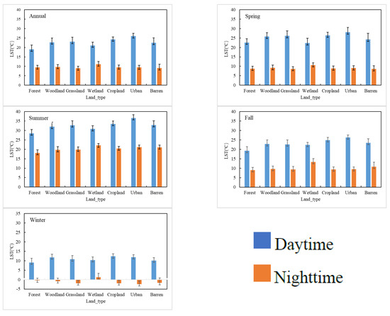 In order to assess the effect of land cover on LST, the average LSTs of different land cover types were calculated (Table 3). The LST differences among land cover types were similar in the annual, spring, summer, and fall groups, but different from winter. In the annual, spring, summer, and fall groups, the highest LST was observed in urban and built-up land, while the highest LST occurred in wetland in winter (Table 3). The maximum LST difference among land cover types occurred in summer; the value reached 5.63 °C, which explained why highest STD occurred in summer. The average LST and STD of different land covers in the daytime and the nighttime at seasonal scales were also calculated (Figure 10). The highest LST was observed in urban and built-up land in the daytime while, that occurred in wetland in the nighttime due to the physical characteristics. In addition, we could clearly see that the STD of each land cover type in the daytime was higher than that in the nighttime; this meant the spatial variation of LST in the daytime was more obvious than that in the nighttime.