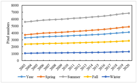 The effect of urban and built-up land on LST at different time scales were further analyzed. As mentioned above, the LST of urban and built-up land was higher than any other land cover types in the annual, spring, summer and fall groups; this meant that the expansion of urban and built-up lands will lead to the increase of LST. In order to prove it, the pixel numbers variation of urban and built-up lands in areas with LST increase at different timescales were calculated. As shown in Figure 11, the pixel numbers in the urban and built-up lands increased significantly from 2003 to 2020 in the areas with LST increasing, especially in summer. Therefore, the conclusion was made that the increase in urban and built-up land could have caused the LST increase, which is similar to that of previous studies [6,7,8]. However, it is not applicable in winter, because the LST of urban and built-up lands was not the highest in winter (Table 3); in addition, the pixel numbers of urban and built-up lands in areas with LST increased, and kept steady in winter from 2003 to 2020 (Figure 11), so the increase of urban and built-up land could not lead to the LST increase.