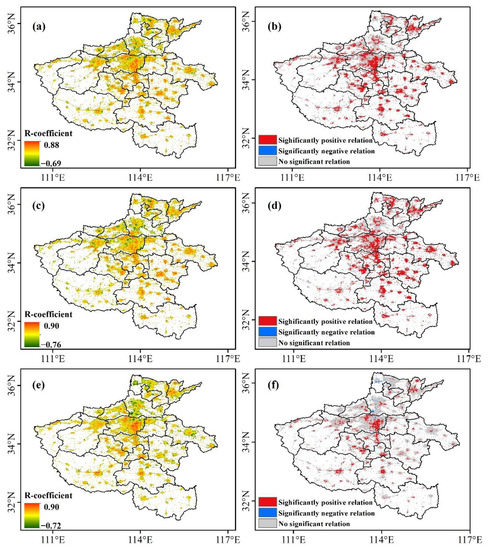 Relation coefficient and its significance between NTL and LST (white areas: no NTL) (a,b) interannual; (c,d) daytime; and (e,f) nighttime.
