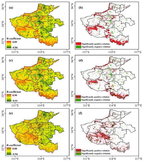The relation coefficient (R_coefficient) between the NDMI and LST ranged from −0.86 to 0.89 for 2003−2021 (Figure 13a). About 15.07% of the region showed a significantly positive correlation (Figure 13b), mainly distributed in the region at the junction of Sanmenxia City, Luoyang City, and Nanyang city, the region along the border of northwest and south of the province with high elevation, while the significantly negative correlation was mainly distributed in urban and built-up areas. This phenomenon is similar to the correlation between NDVI and LST reported by Karnieli et al. and Raynolds et al. [21,51]. Generally, moisture presents a negative correlation with LST [22]. However, energy is the limiting factor of vegetation growth in high elevation areas, that is to say, the LST increase could promote vegetation growth, and the water supply for canopy increases correspondingly, so the NDMI presented a positive correlation. The R-coefficient and its spatial distribution in the daytime and the nighttime were similar to that of the annual scale (Figure 13a–d), but the areas with a positive correlation shrunk in the daytime, while the areas with a negative correlation shrunk in the nighttime.