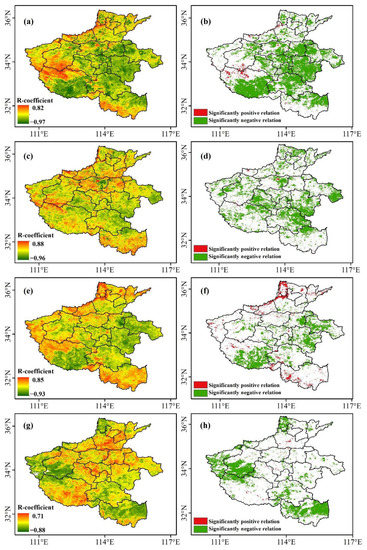 Relation coefficient and its significance between NDMI and LST at seasonal scales (a,b) spring; (c,d) summer; (e,f) fall; and (g,h) winter.