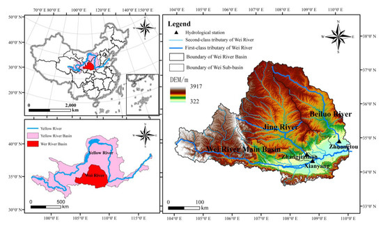 The Wei River originates from the Niushu Mountain in Dingxi City, Gansu, China. It is the largest tributary of the Yellow River, with a geographical location between 34°~38° N and 104°~110° E (Figure 2). The river basin is high in the west and low in the east, and flows through arid and semi-arid areas. It spans the eastern part of Gansu, the south-central part of Ningxia and the central part of Shaanxi, with a total length of 211 km and an area of 132,600 km2. The tributaries of the Wei River basin mainly include the Jing River and the Beiluo River. The Wei River provides the basic water for the development of “Guanzhong–Tianshui Economic Zone” and it is also an important channel connecting the northwest and middle east of China [44]. In addition, it provides a guarantee for sustainable development along the river. Most areas of the region belong to the semi-arid and semi-humid climate in the warm temperate zone. The annual average precipitation accounts for 600 mm with a great inter-annual variation [45]. The annual average evaporation is 700–1200 mm, which is dramatically affected by climatic conditions [46]. The weather is hot and rainy in summer and cold and dry in winter, with an average temperature of 8~14 °C. The runoff is small and remains nearly unchanged under the influence of geographical and topographic elements, resulting in water shortages in the river basin. At present, the basin has not yet formed a unified and coordinated water resources management system. All regions and departments compete for water, resulting in serious disorderly diversions of water [47]. In addition, the water price in the Wei River basin is divided into three classes according to the demand of water consumption by residents, with prices ranging from CNY 3.80/m3 to CNY 7.18/m3. The current water price system cannot effectively play the role of economic leverage for regulation, due to its low price [48].