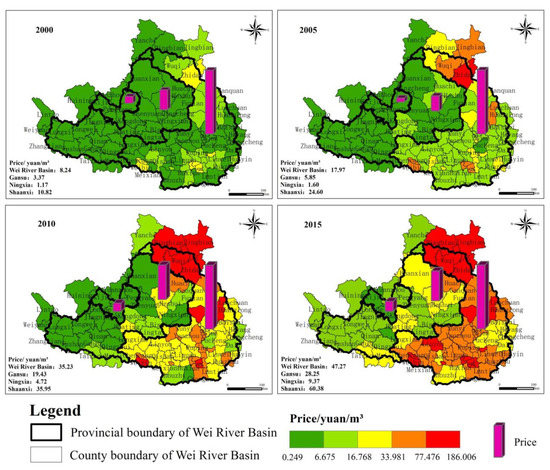 - The price of water yield service in the Wei River basin showed an upward trend with a spatial distribution pattern that was high in the southeast and low in the northwest. The annual price in 2015 was CNY 47.27/m3, 472.937% higher than that of 2000 (CNY 8.24/m3). The high-value areas were mainly situated at the vicinity of Xi’an, while the low-value areas were mainly distributed in the western undeveloped region.