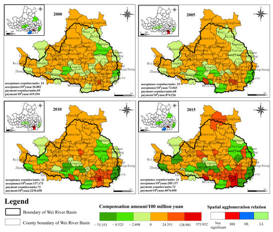 From the perspective of space, counties located in the payment areas with the largest proportion (CNY 0~31.9805 billion) accounted for two-thirds of the whole region. Specifically, the low-value areas of payment (CNY 0~1.2715 billion) were mainly concentrated in the northwest of the region and a few were scattered in the Guanzhong of Shaanxi. The median areas of payment (CNY 1.2715~5.8086 billion) were mainly distributed in the southeast of the region and increased with fluctuation during the period. In 2000, the number of payment county in median areas accounted for 7.246%, but accounted for 54.17% in 2015. The high-value areas of payment (CNY 58.086~31.9815 billion) accounted for the smallest proportion. In 2000 and 2005, the high-value areas were not involved. In 2010 and 2015, the high-value areas were mainly concentrated in the main urban area of Xi’an. This indicated that Xi’an had a relatively high economic development, large population density and rapid development of enterprises and its water demand was far higher than its supply. The acceptance areas (CNY −41.448~0 billion) were relatively small, accounting for one-third of the region, and mainly distributed in the southwest and northeast of the region. The economy in these areas was relatively undeveloped and the water demand was small. Specifically, the low-value areas (CNY −219.7~0 million) showed a decreasing trend during the study period, declining from 19 counties in 2000 to 5 counties in 2015. The median value areas (CNY −5.308~−219.7 million) were mainly scattered and the county number increased first and then decreased, showing an inverted U-shaped trend. The high-value areas (CNY −41.448~−530.8 million) mainly appeared in 2005, 2010 and 2015, and accounted for 47.62% in 2015. Further, according to the LISA cluster diagram, we divided the compensation amounts of water into five categories in the Wei River basin: high-high, high-low, low-high, low-low agglomeration and insignificant. Except for the insignificant counties, the spatial agglomeration characteristics were basically stable. The high-high agglomeration was mainly concentrated in developed areas (Xi ‘an, Shaanxi). The low-low agglomeration was mainly distributed in Ganquan, etc. The spatial agglomeration effects of high-low and low-high types were not obvious and only changed significantly in local areas.