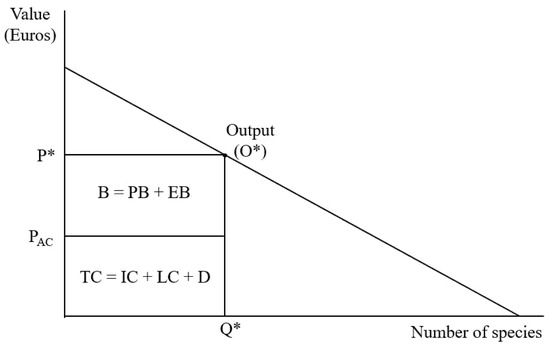 This research concept of biodiversity output refers solely to species threatened with risk of extinction [19] (pp. 41–45). The output of the biodiversity preservation service (the same threatened species may be contributing to other economic products, e.g.,: public recreation services, self-consumption of private amenities by the owners) relates to the wellbeing perceived by the passive consumers in the period, associated with avoiding and/or mitigating the risk of losing a biological species in return for their marginal willingness to pay a simulated additional consumer tax (ACT) and the total cost (TC) [20] (Figure 1, p. 4).