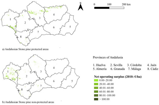 The exception to this rejection of the biodiversity output among scientific publications is that which deals with the estimation of net value added at regional level (with no distinction between protected and non-protected areas) of Andalusian forests as a whole [12] and cork and holm oak woodlands [13,14]. Studies estimating biodiversity outputs have also been carried out at the scale of publicly owned conifer forest farms located in protected areas of Andalusia, one focusing on forests of Pinus nigra Arn., Pinus halepensis Mill., Pinus sylvestris L. and Pinus pinaster Ait. [15] and another on Pinus pinea L. [16].