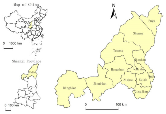 Yulin City is located in the northernmost part of Shaanxi Province, between 36°57′ to 39°34′ north latitude and 107°28′ to 111°15′ east longitude, at an altitude of 1907 m (Figure 1). It has an arid, semi-dry early continental monsoon climate. Yulin City borders Inner Mongolia in the north, Shanxi across the Yellow River in the east, and Ningxia and Gansu in the west; it is connected with Yan’An City in the south. Yulin City has abundant reserves of coal, oil, natural gas, rock salt, and other energy minerals, with 6.22 million tons of coal, 14,000 tons of oil, 100 million cubic meters of natural gas, and an average of 140 million tons of rock salt per square kilometre underground. The territory is wide in the east and narrow in the west, covering a total area of 43,578 km2, accounting for about 21% of the total area of Shaanxi Province. Yulin City has jurisdiction over 10 counties, 222 towns, and 5625 administrative villages. By the end of 2020, the total resident population of the city had reached 3,624,800 [36].