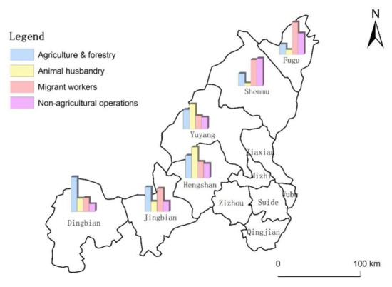 There were significant differences in the participation of farmers in various livelihood activities across the different counties (Figure 2). In terms of agricultural and forestry planting, Dingbian County had the highest participation, accounting for 80%. Fugu County had the lowest participation of farmers, accounting for 20%. In the aspect of animal husbandry, Yuyang District had the highest degree of participation, accounting for 60%; Shenmu County had the lowest participation, with only 6%. Dingbian County had the lowest number of migrant workers, accounting for 32%. The participation rate of other counties in migrant work was relatively high, with marginal differences between the counties. In terms of non-agricultural self-employment, Shenmu County had the highest degree of participation, accounting for 58%; Fugu County accounted for 42%, while the rest of the counties had less than 20% participation. The results show that the degree of participation in migrant work in each county was relatively high, and the difference was small. The difference in participation in agricultural and forestry planting, animal husbandry, and non-agricultural self-employment was greater. Shenmu County and Fugu County consisted of mainly migrant workers and those in non-agricultural self-employment, and the degree of participation in planting and animal husbandry was relatively low. The dominant livelihood activity in Yuyang District was animal husbandry, with participation in non-agricultural self-employment. In Dingbian County, agricultural and forestry planting were the main livelihood activities, with low participation in migrant work and non-agricultural self-employment.