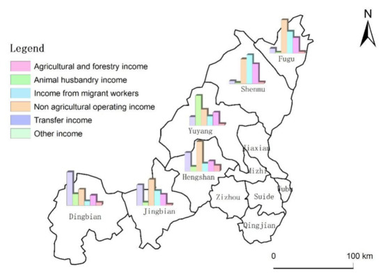 There are significant differences in the farmers’ choice of livelihood strategies and income levels in different counties. The highest participation of farmers in agricultural planting, migrant work, and non-agricultural self-employment are Dingbian County (80%), Fugu County (64%), and Shenmu County (58%). The farmers in Yuyang County have the highest participation in animal husbandry. The highest income contribution from the sum of agricultural planting, animal husbandry, migrant work, and non-agricultural self-employment are Dingbian (42.71%), Yuyang (38.16%), Fugu (42.69%) and Shenmu (36.79%). This shows that farmers’ livelihoods are heavily dependent on natural assets, and the conditions of natural assets are difficult to change in a short period of time. Therefore, farmers’ livelihood strategies and income levels will remain different in various types or regions [46,47].