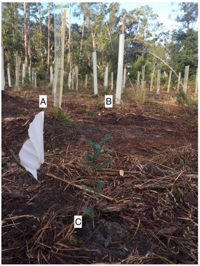 The height, color, and material of tree shelters can affect tree responses. Shelter height should be above the herbivore browse line to ensure that emerging seedlings are not browsed [21,22]. If the shelter height is too short and below the browse line, then shelter effectiveness decreases [19,23]. Shelter color and material can influence light, temperature, and airflow, thereby affecting the microenvironment within the shelter [18,19,24,25]. In comparison to solid tube shelters, fabric and mesh shelters typically have less of a greenhouse effect on the microenvironment, radiation is direct, and air movement occurs through the tree shelter, improving evaporative demand; these microenvironmental differences between both types of shelters have intensive effects on survival and growth [18,19,26,27]. In some cases, these microenvironments can be beneficial, but are both species- and location-dependent [18,27,28]. There is still a need to improve knowledge about the specific effects of the type of shelter in a wide array of forest ecosystems affected by herbivores.
