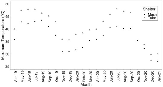 Maximum air temperatures (°C) averaged by shelter treatment (mesh and tube shelters included) from April 2019 to January 2021. Air temperature was recorded every 15 min.