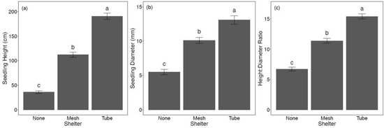 For both mean height and mean diameter, there was no significant interaction between shelter and fertilizer. After two growing seasons, the effect of shelters was significant for height (F2,241 = 174.43, p < 0.001), diameter (F2,241 = 49.14, p < 0.001), and height:diameter ratio (F2,241 = 122.00, p < 0.001). Overall, seedlings protected by solid-wall tube shelters had the greatest growth, as indicated by height and diameter followed by intermediate growth for mesh shelter seedlings, and the least growth for non-sheltered seedlings (Figure 4a,b). This pattern also held for height:diameter ratios (Figure 4c).
