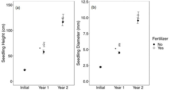 Mean ± SE (a) height (cm) and (b) diameter (mm) of Quercus virginiana seedlings at the time of planting (initial), after the first growing season (Year 1), and after the second growing season (Year 2). Seedlings either did not receive fertilizer or received 20 g of fertilizer. Asterisks indicate significant differences among the fertilizer treatment levels (α = 0.05).