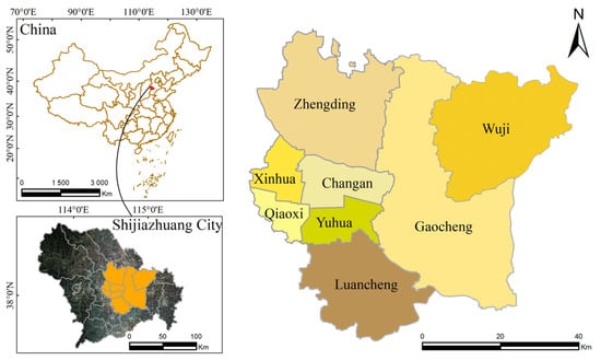 Shijiazhuang is located at the eastern piedmont of the Taihang Mountains, and the eastward airflow is blocked by the mountains and then sinks, causing the temperature in the area at the piedmont of the mountains to rise. Shijiazhuang, as the capital of Hebei Province, has experienced rapid urbanization since the 1990s, with large-scale urban land expansion and migration of people to the center of the city for better public services and job opportunities. The study area in this study covers the downtown (Xinhua, Changan, Qiaoxi, Yuhua), two districts (Gaocheng, Luancheng), and two counties (Wuji, Zhengding) (