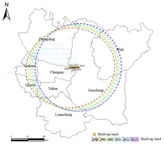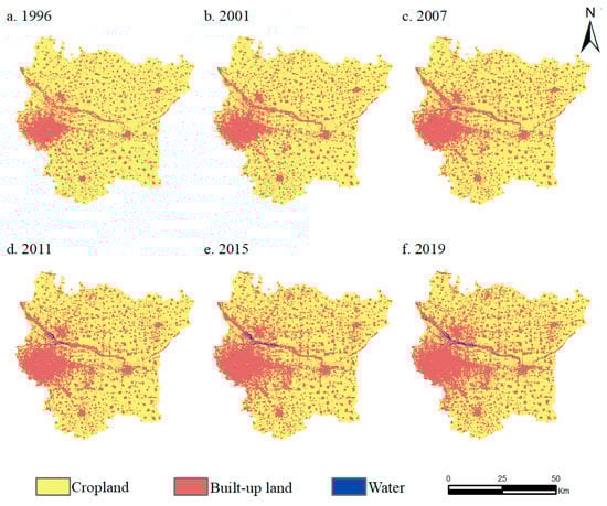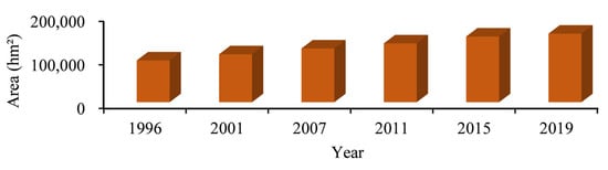 Figure 2), with the help of the reclassification tool in the ArcGIS software. The statistics of the built-up land area for each year were also summarized based on the ArcGIS software (