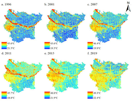 Spatial pattern of the land surface temperature (LST) in the study area from 1996 to 2019.