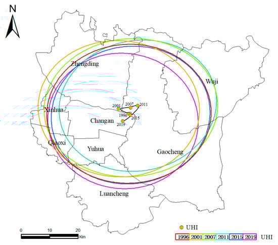 Evolution of center points and standard deviation ellipse (SDE) of the urban heat island (UHI) of the study area from 1996 to 2019.