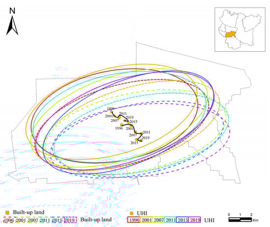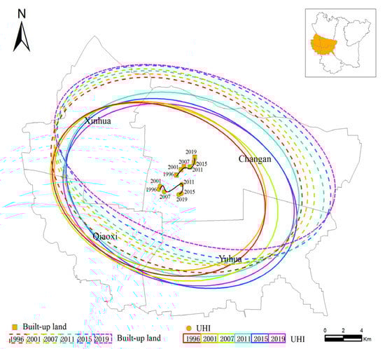 Evolution of center points and standard deviation ellipse (SDE) of the built-up land and urban heat island (UHI) of Yuhua District from 1996 to 2019.