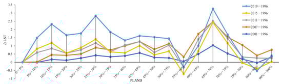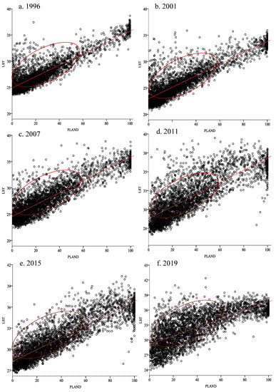 8], but some previous studies also indicated that not all landscape pattern indices are applicable and the surface thermal environment is predominantly associated with the percentage of built-up land (PLAND). In fact, the percentage of vegetation and the PLAND were both highly correlated with surface temperature [