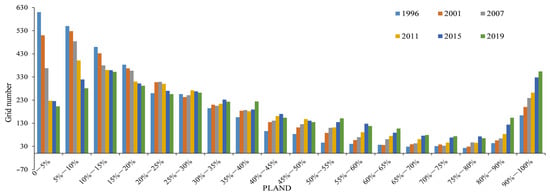 Figure 11 shows the response mechanism between the PLAND and LST. When the PLAND value is below 20–25%, the number of the sample grids decreased year by year, and when it is above this range, the number of the sample grids increased year by year. In particular, the number of sample grids in the 25–30% range tended to be the same, and the difference in the number of sample grids gradually increased as the value increased, indicating that the low-density built-up land in each grid gradually was transformed into high-density built-up land, and there was significant built-up land expansion.