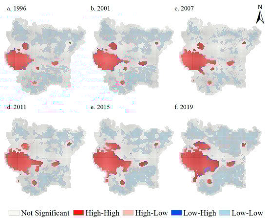 LISA cluster map of impacts of the percentage of built-up land (PLAND) on land surface temperature (LST) from 1996 to 2011.