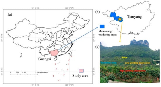 Location of the study area and growth of mangoes. (a) Geographical location of the study area, (b) main mango producing areas and the exact location of the study area in Baise City, (c) live picture of peak-cluster depression and the allocation of sampling.