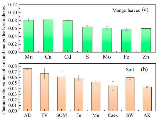 The final screening results are shown in Figure 2. The indicators with high characteristic values for the soil were AB, FV, SOM, Fe, Mn, Caex, SW, and AK, in order of size. The indicators with high eigenvalues for the mango leaves were Mn, Ca, Cd, S, Mo, Fe, and Zn, in order of size. The higher the eigenvalues, the more significant the variability in the index content in the different geomorphic parts of the landscape. For soils, the variability in the index contents of AB, FV, SOM, Fe, Mn, Caex, SW, and AK was greater, which best explained the soil index classification results. For the mango leaves, the contents of Mn, Ca, Cd, S, Mo, Fe, and Zn were more variable, and this best explained the results of the mango leaf index classification.