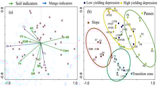 In contrast, the variability in the different geomorphic parts of the landscape was obvious and clustered into four categories, namely, the transition zone and low-production depressions category, low-production and high-production depressions category, slopes category, and passes category. This clustering pattern indicates that there was significant variability among the four geomorphic parts of the landscape, which is corroborated by the variability in mango flowering and fruiting. The interconnectedness of the transition zone and the depressions, with less variability in the content of the key factors, the soil conditions, and mango growth, is the main reason for the clustering of the transition zone and the depressions in the low-production area.