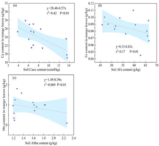 Uptake and utilization relations of Fe, Mn, and Ca elements in mango. (a) Relationship between Caex content in soil and Ca content in mango leaves, (b) Relationship between AFe content in soil and Fe content in mango leaves, (c) Relationship between AMn content in soil and Mn content in mango leaves.