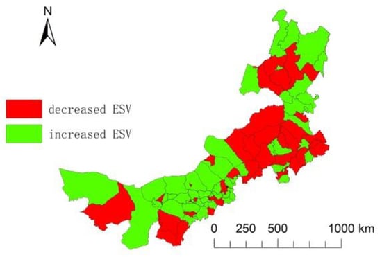 From 2000 to 2020, the areas of increased and decreased ESV in the Inner Mongolia Autonomous Region were 661,699 km2 and 484,226 km2, respectively, accounting for 57.74% and 42.26% of the total area (Figure 2).