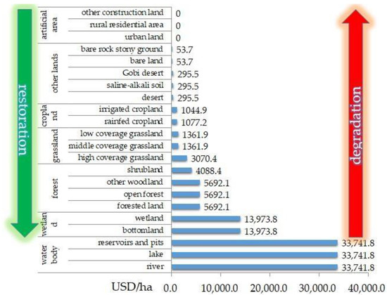 This study modifies the evaluation rule of LUCC in the Inner Mongolia Autonomous Region Based on the ESV value per unit area. In the evaluation of ESV, the ESV of grassland per unit area is higher than that of cropland. Considering the ecosystem services of both land cover types, the conversion of grassland to cropland should be considered degradation. The ESV per unit area of water bodies was the largest, so the transformation of water bodies into other land use types was defined as degradation. After modifying the rule, the difference in the degree of land restoration or degradation could be determined by measuring the change in ESV. For example, the ESV of 1 hectare of forest converted into wetland increased by USD 8284.3, and the ESV of 1 hectare of other land (desert) converted to wetland increased by USD 13,678.3. Similarly, the ESV restoration coefficient of other land is 1.65 times that of forest restoration.
