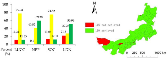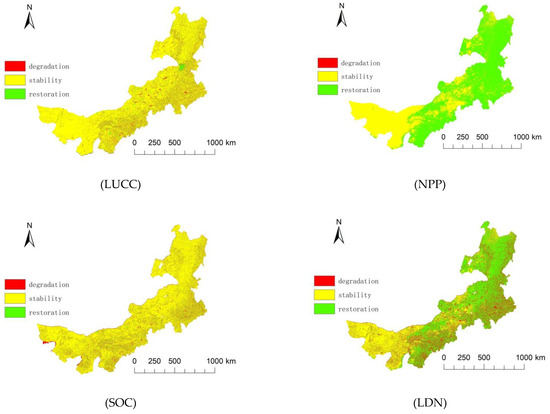 To evaluate LDN, the “union” of the degradation of the three indicators was considered, where the degradation of all three was required to determine the failure of LDN. In this way, a degradation LDN result is more inclusive than a degradation result for each contributing indicator. Areas of stable LDN are considered the “intersection” of the stable areas of the three indicators. Here, once an area experiences degradation or restoration, the stable state transitions to other states, and for our study area, the minimum proportion of stable LDN was only 27.25%. The restoration proportion of LUCC and SOC was relatively small, while the restoration proportion of NPP was relatively large, and the LDN results indicated a large proportion of land restoration, which highlights the impact of NPP on the evaluation of LDN. Finally, the proportion of stability assessed by LUCC and SOC was more than 70%, while the proportions of restoration and degradation were less than 30%, illustrating a “one-pole stability” state. The proportion of NPP degradation was less than 1%, while the proportion of restoration and stability accounted for more than 40%, showing that restoration and stability account for the main “two poles” (Figure 5). The areas of failed and successful LDN accounted for 8.25% and 91.75% of the whole region, respectively (Figure 5).