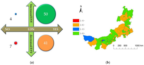 Relationship between LDN and ESV assessed by the number of counties (a) and spatial distribution (b). In (b), “−” represents the negative performance of LDN or ESV, while “+” represents the positive performance.