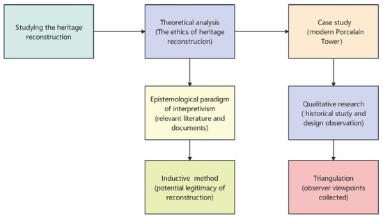 For the single case study, a historical survey and design review with qualitative research has been conducted through direct observation of the Porcelain Tower and its reconstruction process. Triangulation of the viewpoints gathered from local media, research works, archaeological reports, and internet documents enhances and balances the interpretation of the underlying motivations and aspirations of the different stakeholders in the reconstruction project. These include the investor, city fathers, cultural officers, designers, and the public. An illustration of the research methodology and instruments can be viewed in Figure 1.
