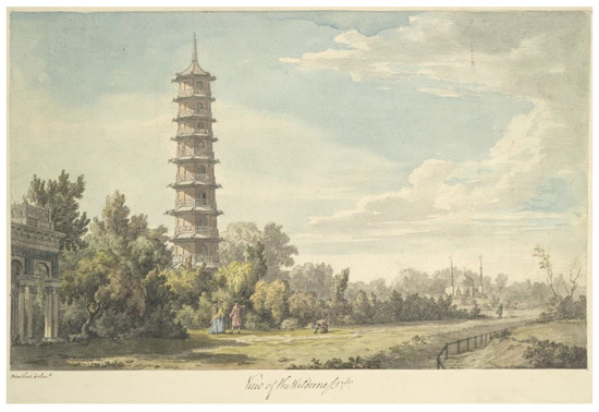 A view of the Great Pagoda at Kew Gardens in 1763 (Metropolitan Museum of Art, CC0 1.0, via Wikimedia Commons, https://en.wikipedia.org/wiki/Great_Pagoda,_Kew_Gardens#/media/File:View_of_the_Wilderness_at_Kew_MET_DP105027.jpg, accessed on 5 May 2022).